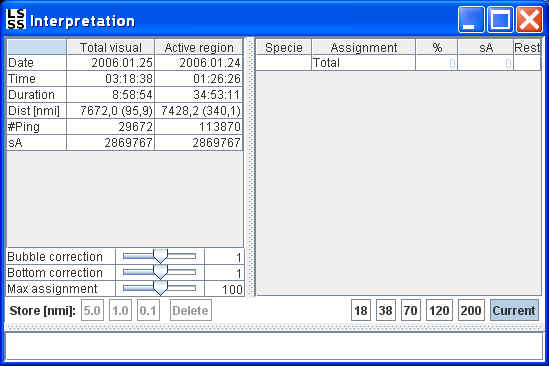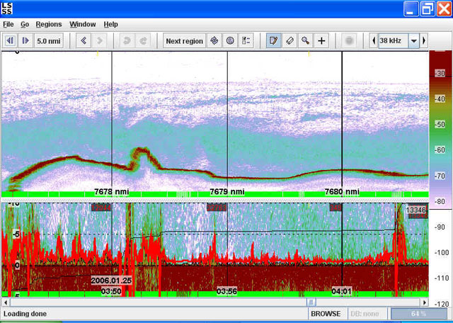 This window is normally the largest, and shows the echogram for the selected region and for a selected frequency.