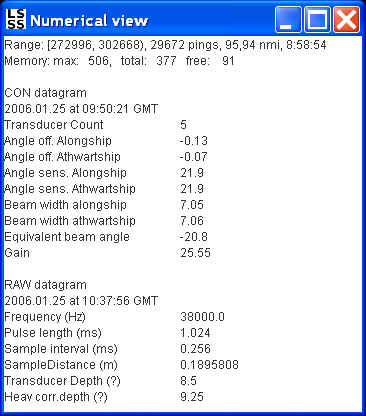 The "RAW datagram" shows numerical information about a specific ping in the current survey selected by means of the cursor.