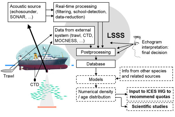 Acoustic data are the basis for estimating fish stock abundance of many marine species. Sometimes there are so much data that these have to be processed partly in real time. The collected data are interpreted aided by additional information, i.e. trawl catches. The results are stored as acoustic abundance, which in turn is used as the basis to estimate the size of the fish stocks and recommendation of fishing quotas. The figure below show one possible workflow from data collection to recommended fishing quotas. Although the data flow is general, not all authorities work like this.